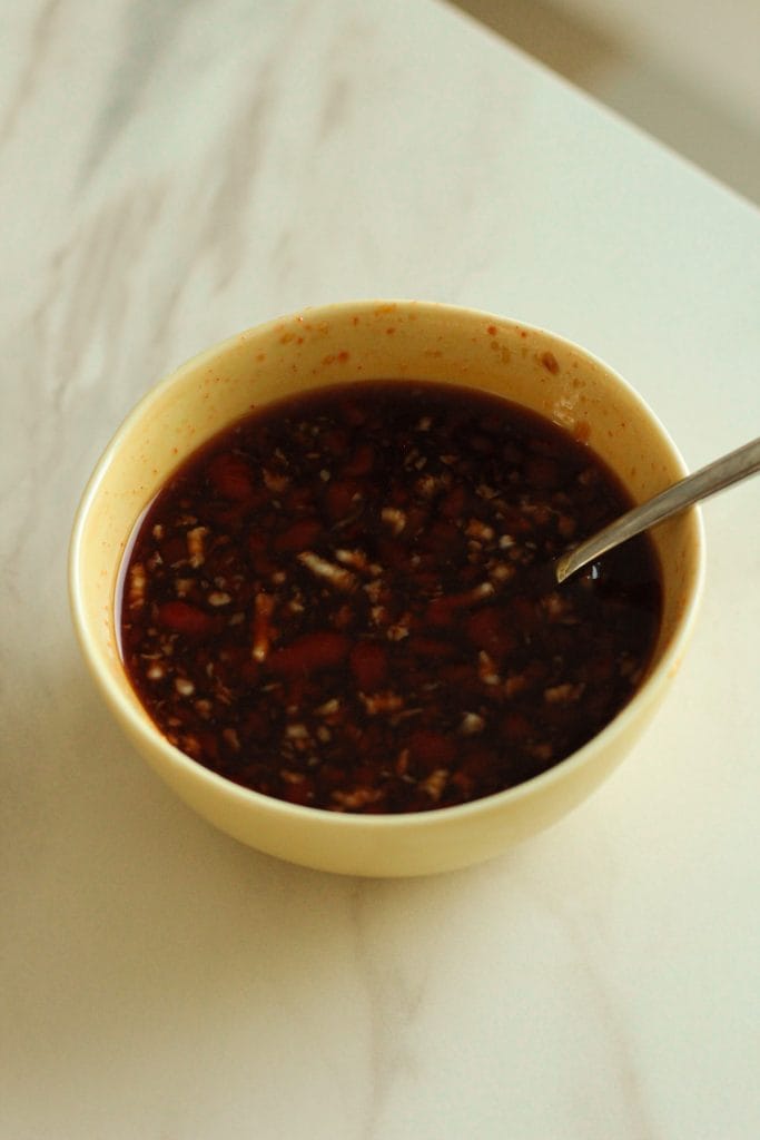 • In a small bowl make a glaze. Whisk together the soy sauce, honey, rice vinegar, sriracha, grated garlic, and ginger. Set aside.
